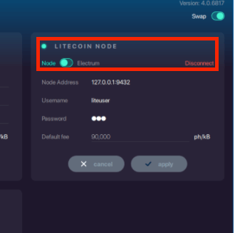 Under the Litecoin tab, enter the node ip:port address along with the RPC username and password. The fee paid on the respective chain per Kb of transaction size can be left at the default value.