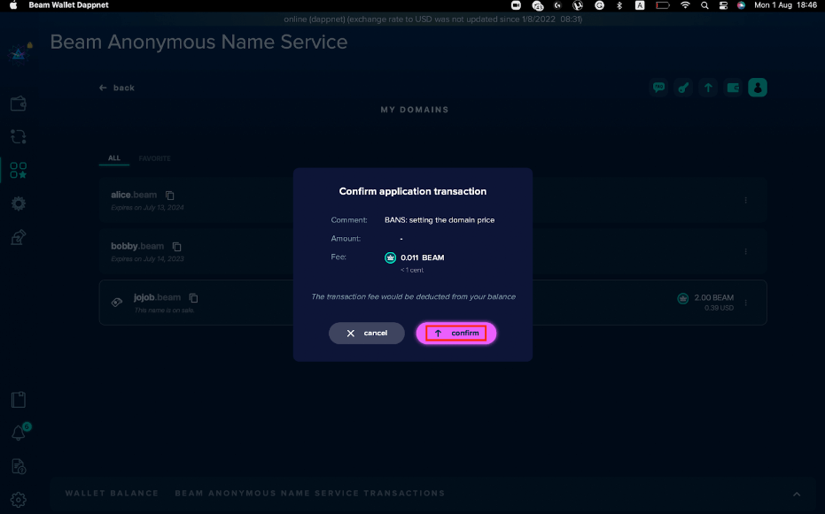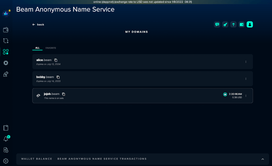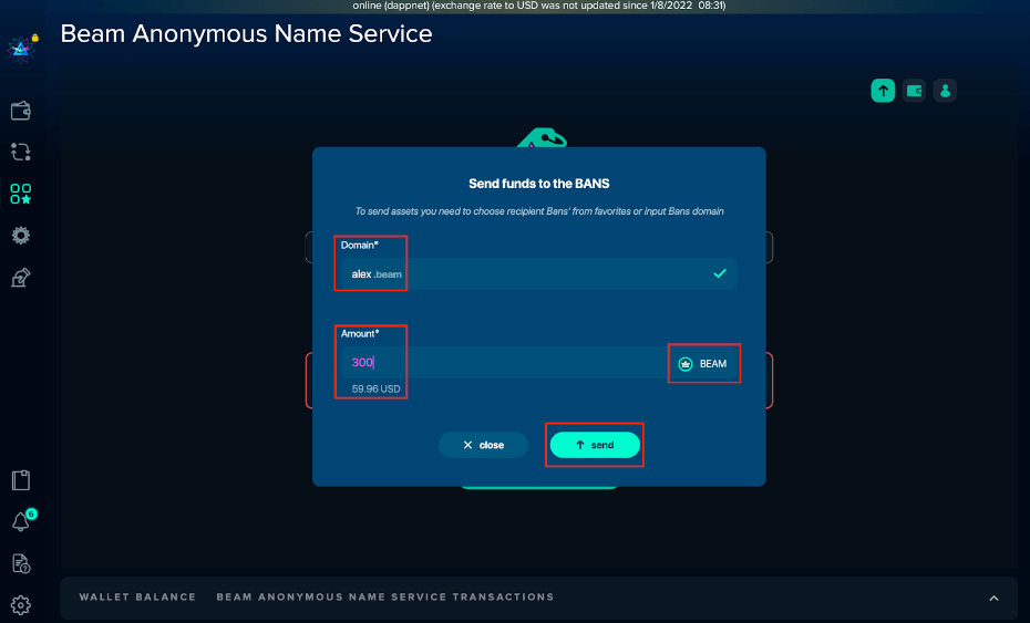 Users can send Beam directly to a BANS domain and avoid the headache of sending to a wallet address. Beams coins are the only asset currently available to send via BANS DApp.