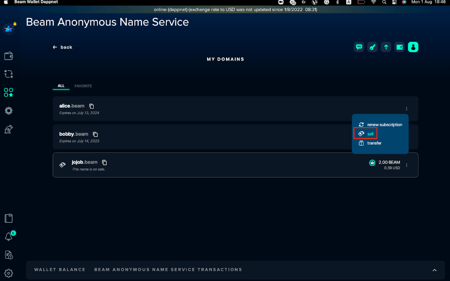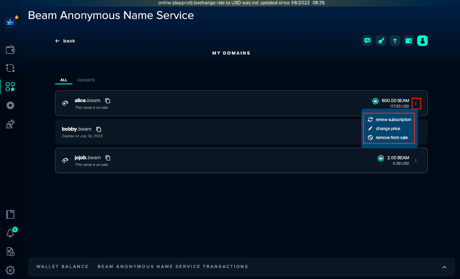 6. Your BANS domain is available for purchase on the BANS Marketplace. Users renew their registration, alter the sale price or remove it entirely from BANS marketplace.