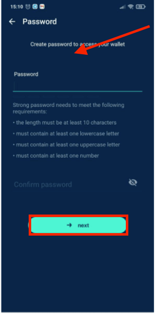 Select a password (eight characters minimum, at least one letter, number, or special symbol) that will give you access to your Beam wallet. Your wallet password is an extra lock for your device, while your seed phrase is a private key that identifies your wallet and can access your funds.