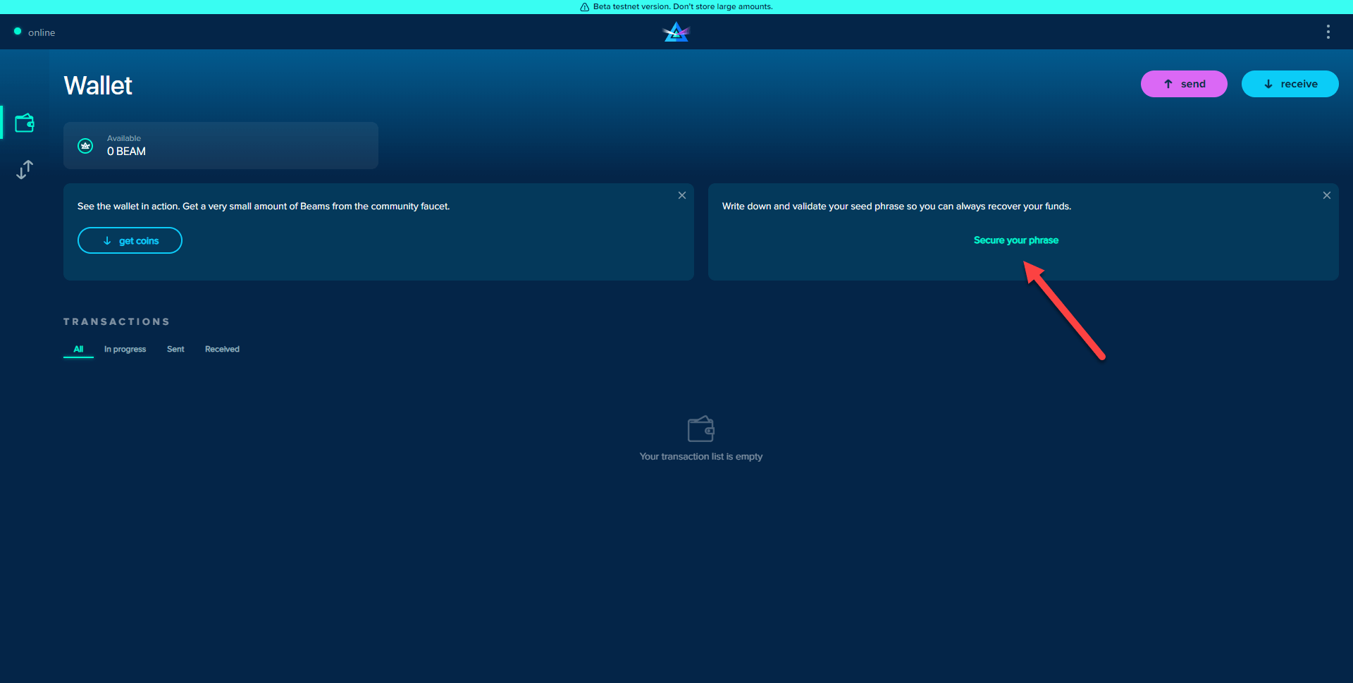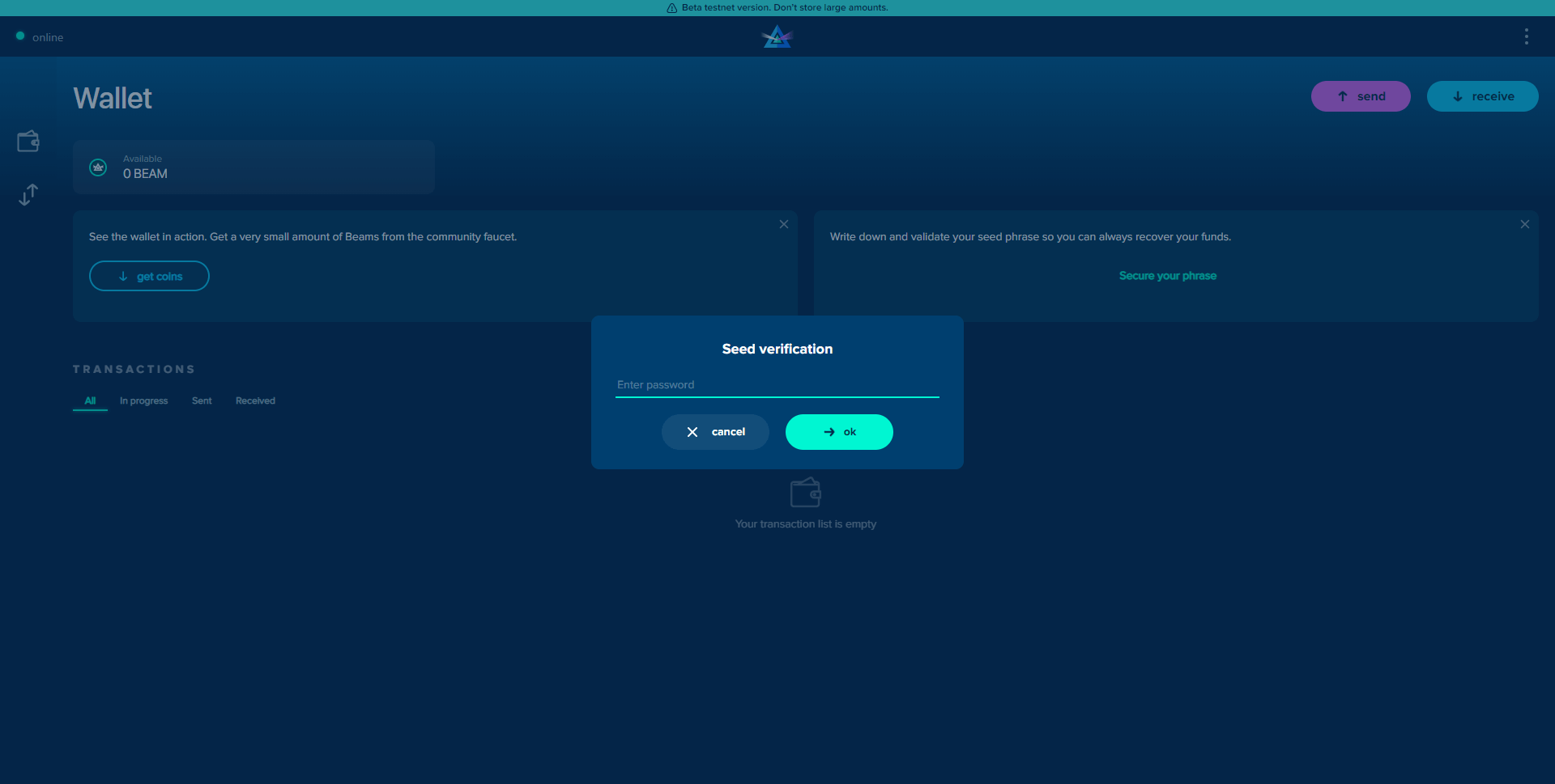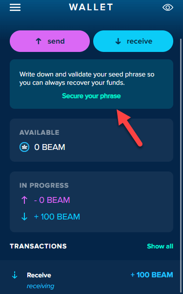 If you skip the seed verification process, your web wallet will give you pop-up reminders to verify your wallet. You can close these pop-ups, but once your wallet balance exceeds 100 Beams, the notification will stay open until you secure your seed phrase.