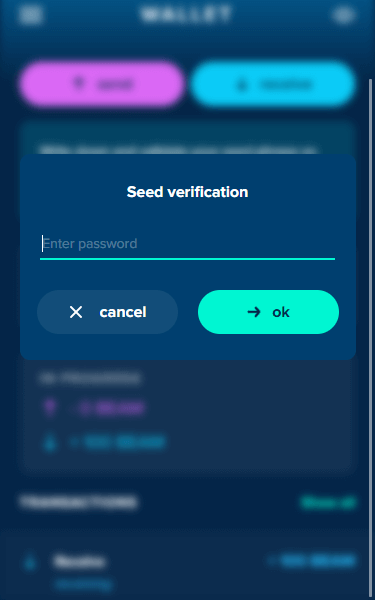 You will receive a prompt to asking you to confirm your wallet password before moving to the next step of the seed verification process.