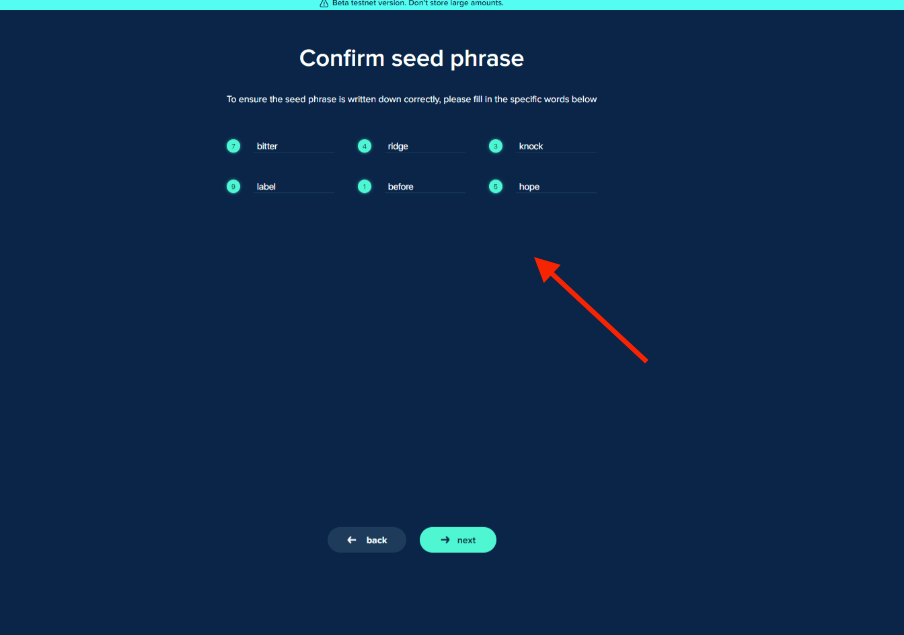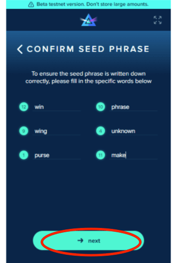 Double-check your spelling before storing your seed phrase in a secure location. Never share your seed phrase with anyone!